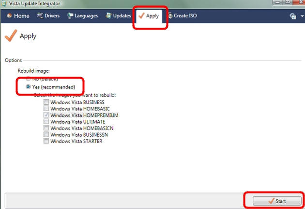 Для завершения процесса перейдите во вкладку Apply. В меню Rebuild image нажмите Yes, потом Start. Процесс сборки нового установочного файла - именно тот