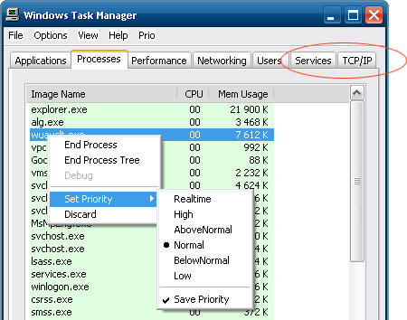 Добавление вкладок Services и TCP/IP для просмотра запущенных служб и сетевых соединений, функции сохранения выставленного приоритета для любого